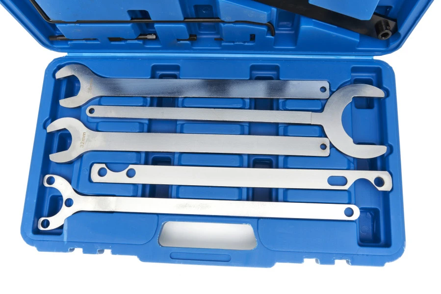 Deze 5 delige waterpompsleutelset is geschikt voor het vasthouden van de visco-koppeling van de aandrijfas in een BMW en Ford. De poelie van de waterpomp blijft op zijn plaats terwijl de radiateurventilator wordt losgemaakt. Ook is deze waterpompsleutelset geschikt voor het verwijderen van de visco-koppeling op de koelventilator. Deze set wordt geleverd in een handige koffer.