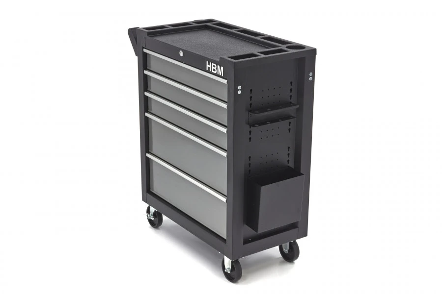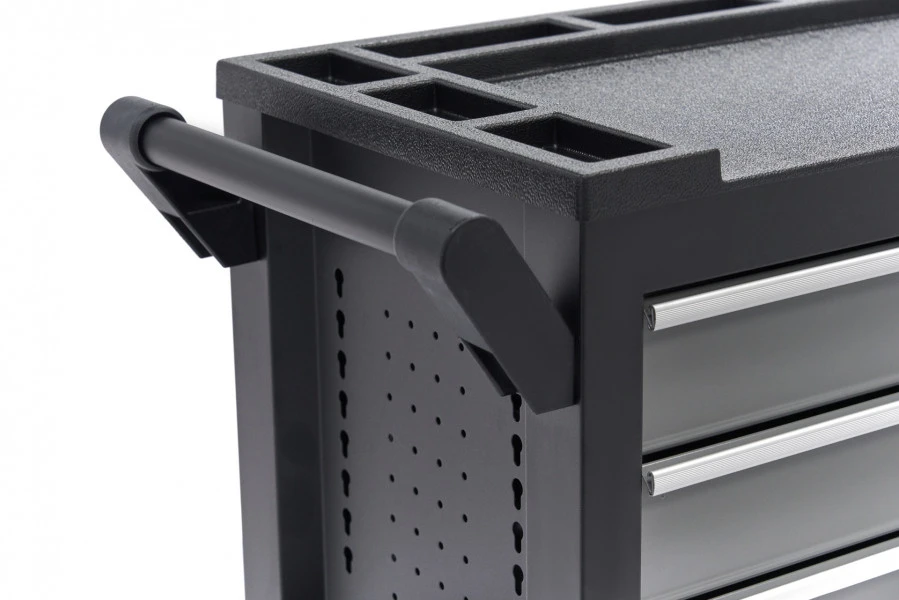 Deze gereedschapswagen biedt voldoende ruimte voor het veilig opbergen van allerlei soorten gereedschap. Het is de ideale oplossing voor kleinere werkplaatsen en garages. Je duwt de wagen vlot voortuit met een uitstekend, stevig handvat vooraan. Daarbij beschik je naast over lades ook over een klein opbergvakje aan de voorzijde.